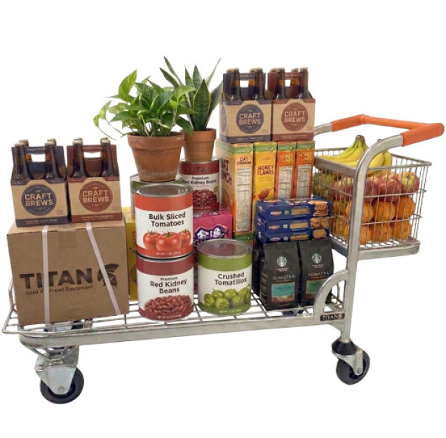 Cash and carry trolley with integral rear basket load capacity 500kg FREE Delivery. Dimensions (L)1480x(W)720x(H)925mm. Fully nestable with rod infill sprung base for nestability. Base fitted with two fixed and two swivel 150mm polyurethane castors. All steel framework. Fitted with integral rear basket size (L)230x(W)665x(H)350mm bright zinc plate finish.