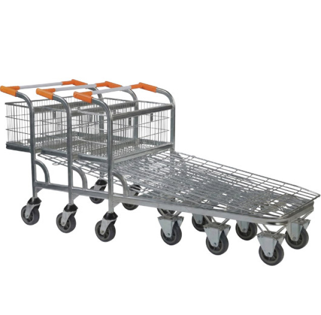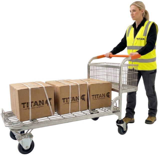 A key feature of this model is its fully nestable design, allowing several trolleys to be stored together to maximise valuable floor space when not in use. The integral rear basket offers convenient storage for smaller items, tools or loose goods, making it ideal for mixed-load transport.